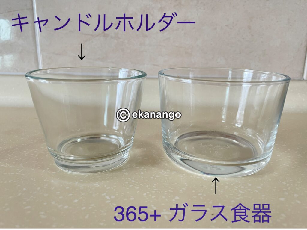 因みにIKEAのキャンドルホルダーも我が家では食器としてよく使っていて、今回の食器との大きさの違いはこんな感じ↓。